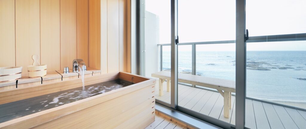 オーシャンビューバスも大型の木製の浴槽を採用し、柔らかい木の香りの中、潮騒を聞きながら心地よい入浴タイムをお楽しみいただけます。