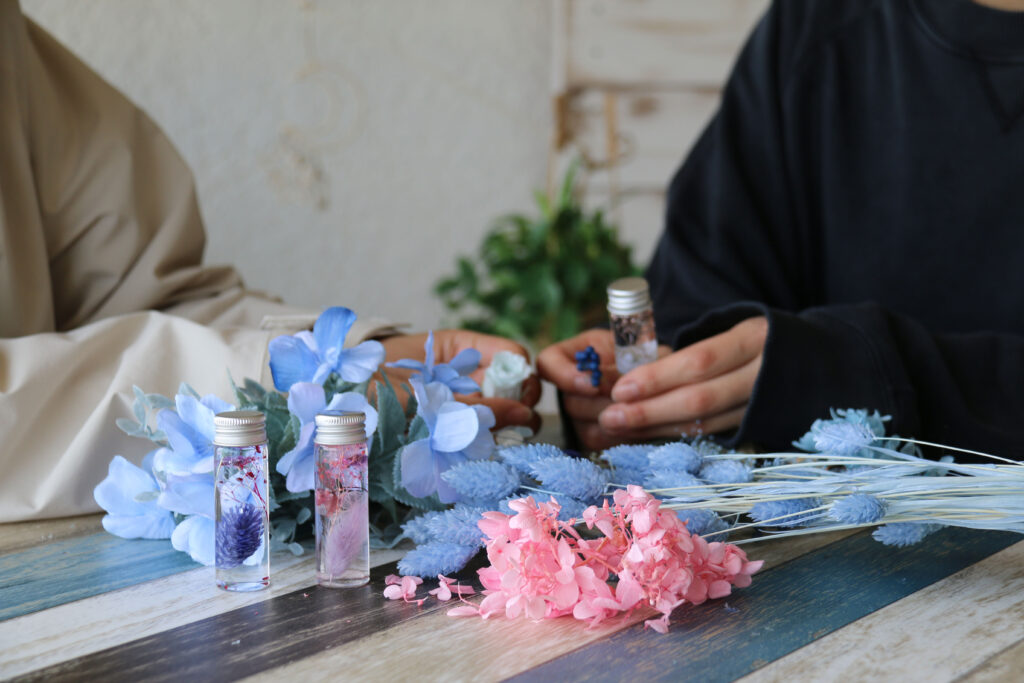 さらに、数量限定でプリザーブドフラワーやドライフラワーを使用した『ミニハーバリウム作り』の体験も。透明なガラスボトルに“花の美”を閉じ込めた作品は、そのままご自宅のインテリアや大切な人へのギフトとしてお持ち帰りいただけます。